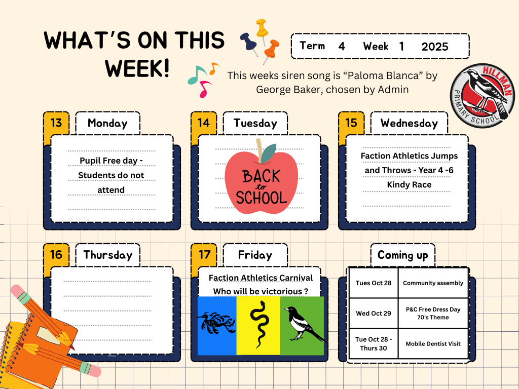 What’s on this week! Term 4 Week 1 10/14/202509/04/2023 by Hillman Primary School Keep up to date with What’s on this Week!
